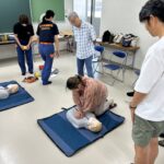 訓練用人形を使っての救命処置の実技では、「相手に怪我をさせるかもしれないと不安があったが、胸骨圧迫の大切さがわかりました。」との感想。