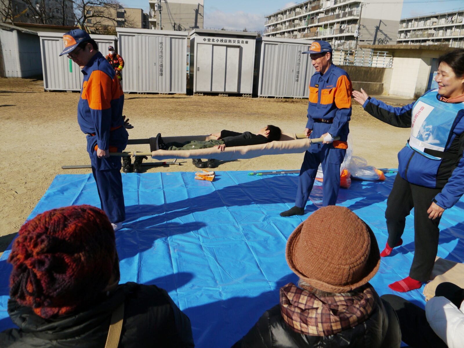 応急担架による搬送は要搬送者の足の方へ進みます。頭の方の担ぎ手は要搬送者に声掛けを行い、容態を観察します。