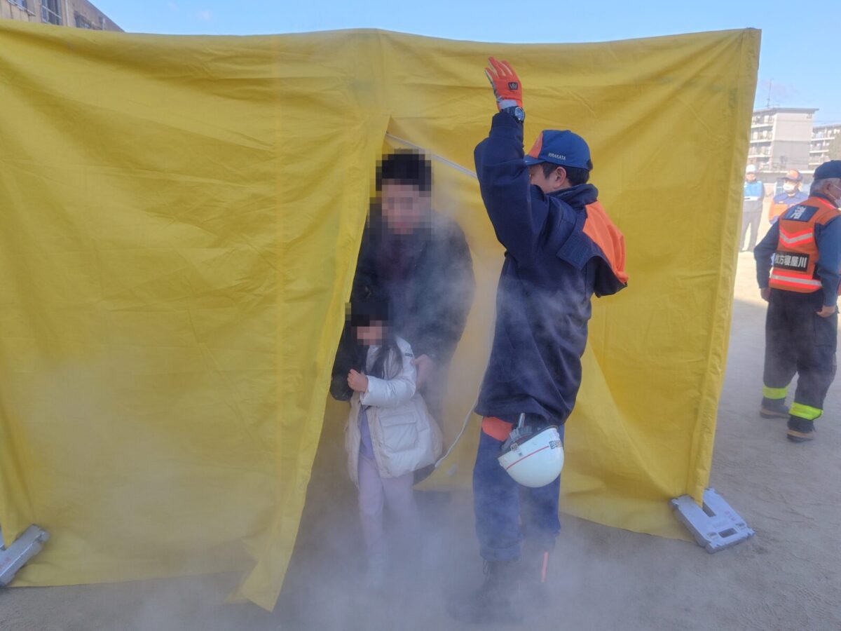 テントの中にドライスモーク(安全性の高い擬似煙)を充満させて、その中を通り抜ける事で火災時にどの様に避難したら良いか訓練をするものです。