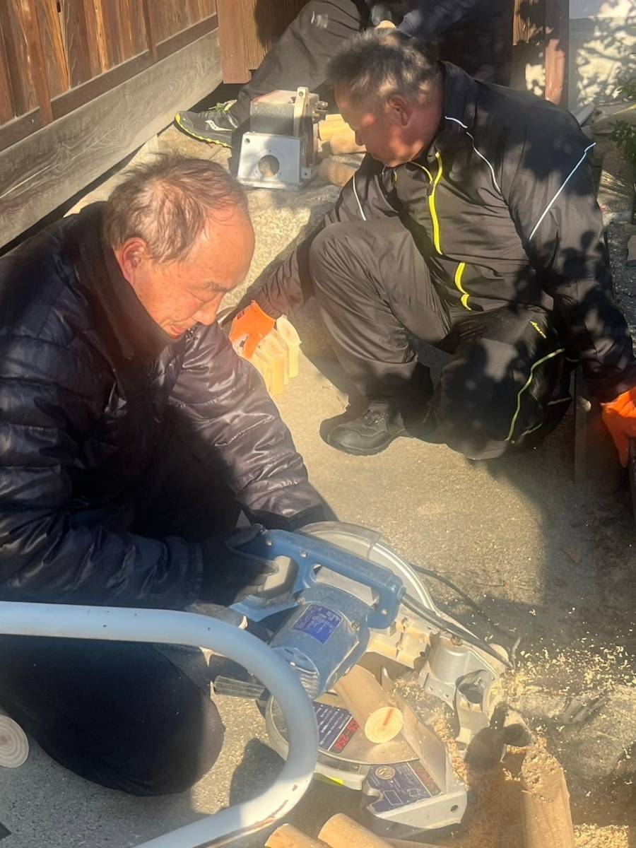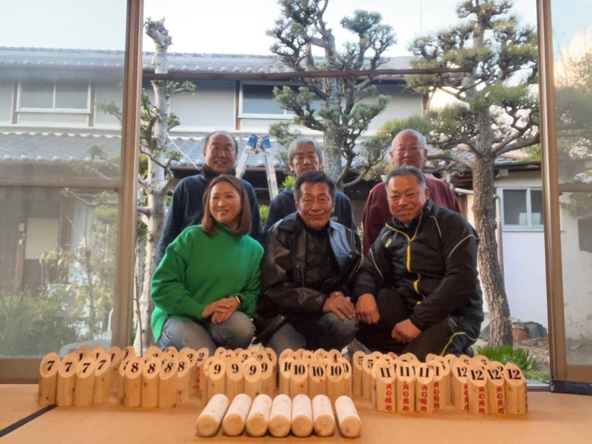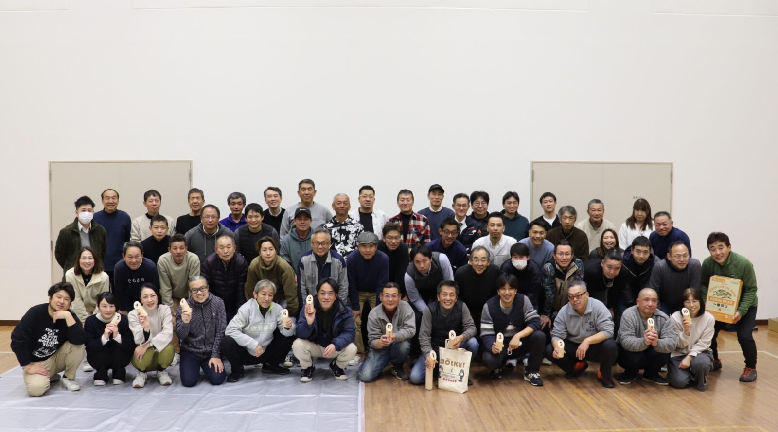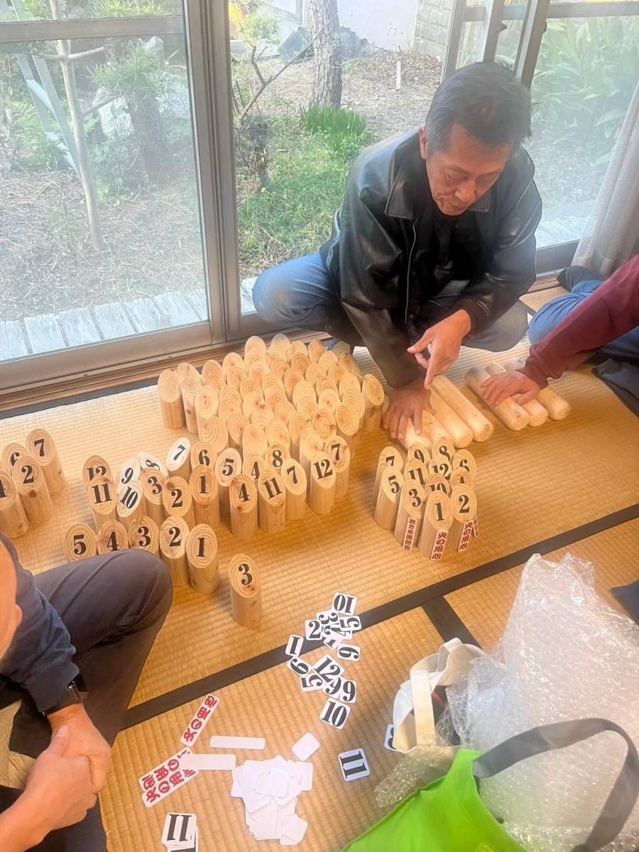 1月13日(消防出初式翌日)、副団長らは中団長宅に集合していました。目的は、この大会で使用するモルックの道具を手作りしようというものでした。作業当日に写された画像からも幹部の皆さんの一生懸命さが伝わってきます。ご覧のとおり、どの道具も丁寧な仕事がされており、団員の皆さんに対する思いやりが感じられます。 また、持ち運びがしやすいようにと専用のトートバックを…これも手作り。「各分団から、また市民の皆さまから要望があれば貸し出しますよ。」と、バッグのデザイン(プリント)を手がけた井上副団長が皆の前でお知らせした。
