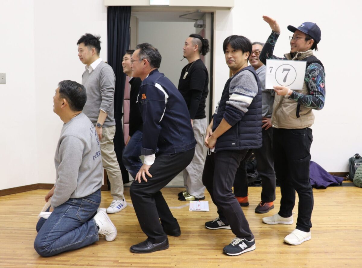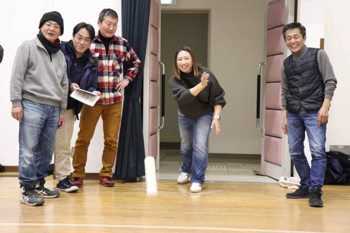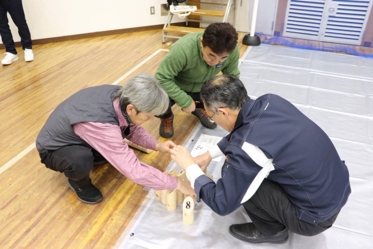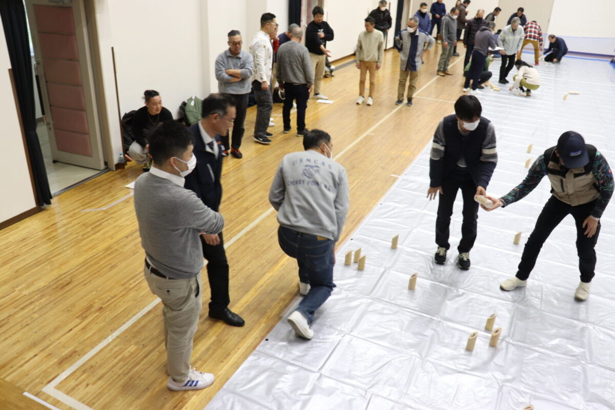 井上副団長の競技ルール説明の後に競技が開始。各分団から4名の精鋭が出てワンチームを形成し、組み合わせで決まった相手チームと各コートに分かれて第一回戦を開始しました。順位は4試合の合計点で決め、得点が上位のチームから順に組み合わせて第二回戦に臨みました。力の均衡するチーム同士を競わせたことが功を奏したのか、どのコートも白熱した試合となりました。今回は、枚方市消防団の11分団に事務局(危機管理部)、団本部そして広報部を加えた14チームで勝敗を競いましたが、「ボウリングよりもええなっ」「モルック棒がどう転んでいくかわからんのが面白い」「これだけのおっさん連中が、初めてやったモルックで無邪気になっとる」など会場は笑顔と笑い声に包まれていました。