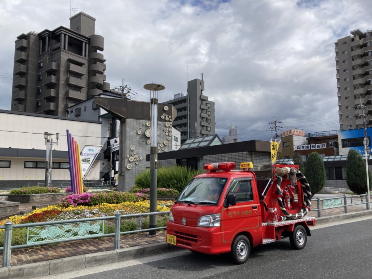車両広報は枚方市消防団全分団(11分団)を対象として、令和3年5月1日(土)・2日(日)・8日(土)・9日(日)の4日間で実施し、枚方市内の主な駅前や公園、公共・商業施設付近、幹線道路等で重点的に広報活動を行っております。
