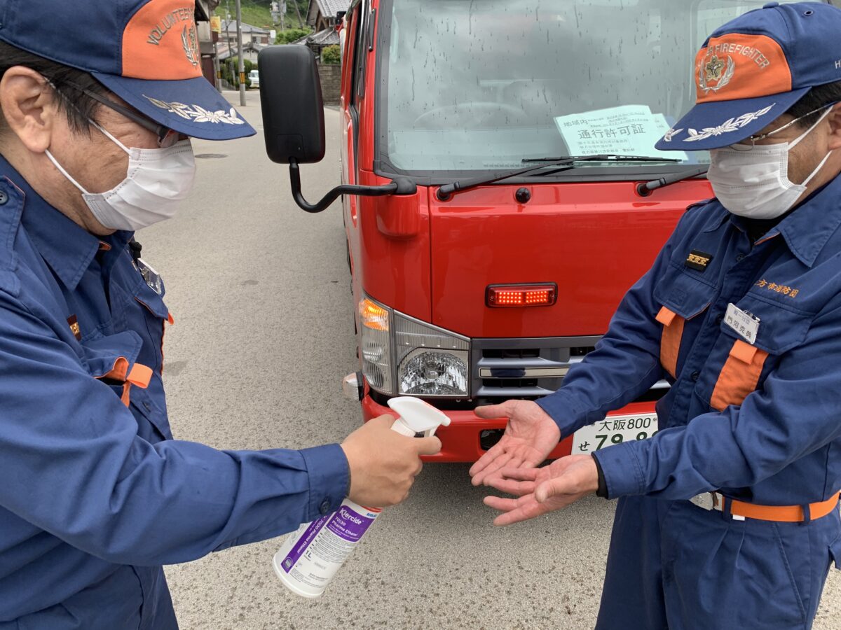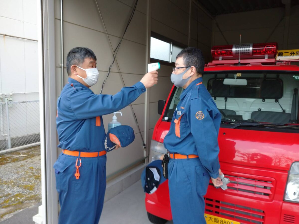 また活動前にはすべての消防車両に配備されている体温計で検温を実施するとともにマスクを使用し、手指消毒を行い感染予防に努めております。