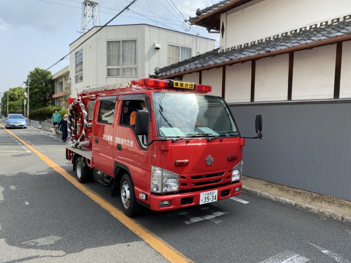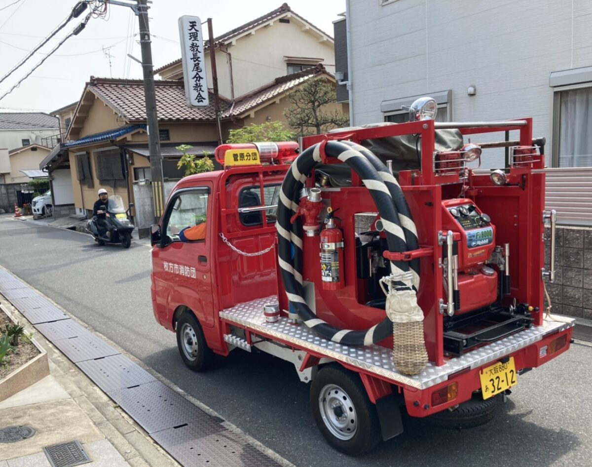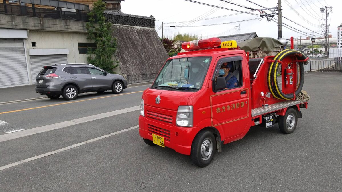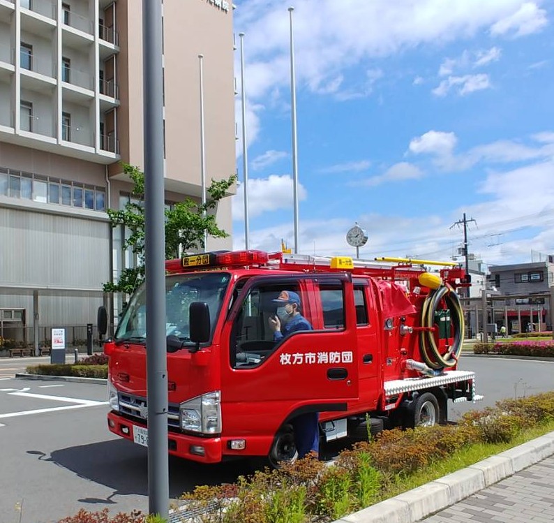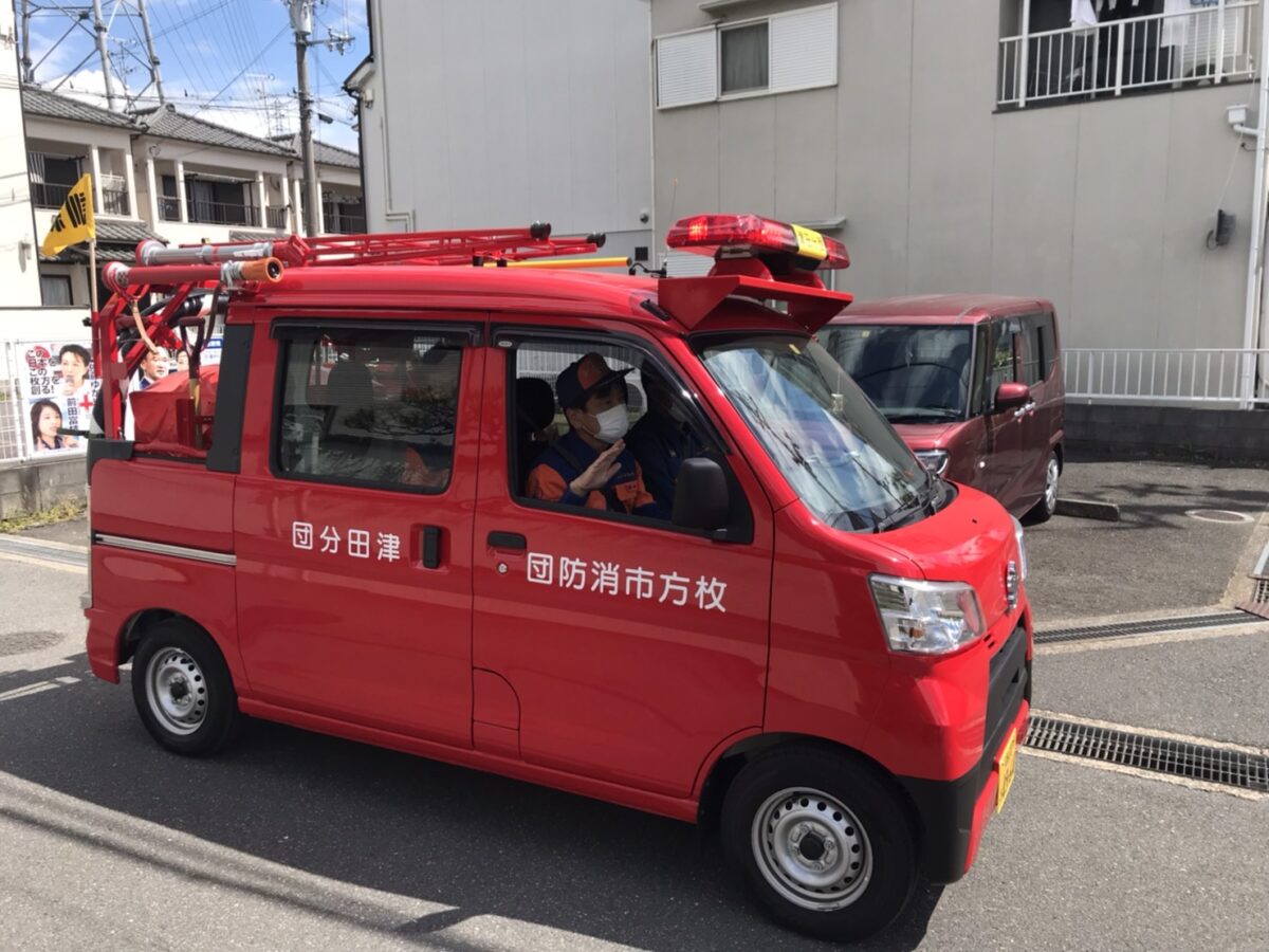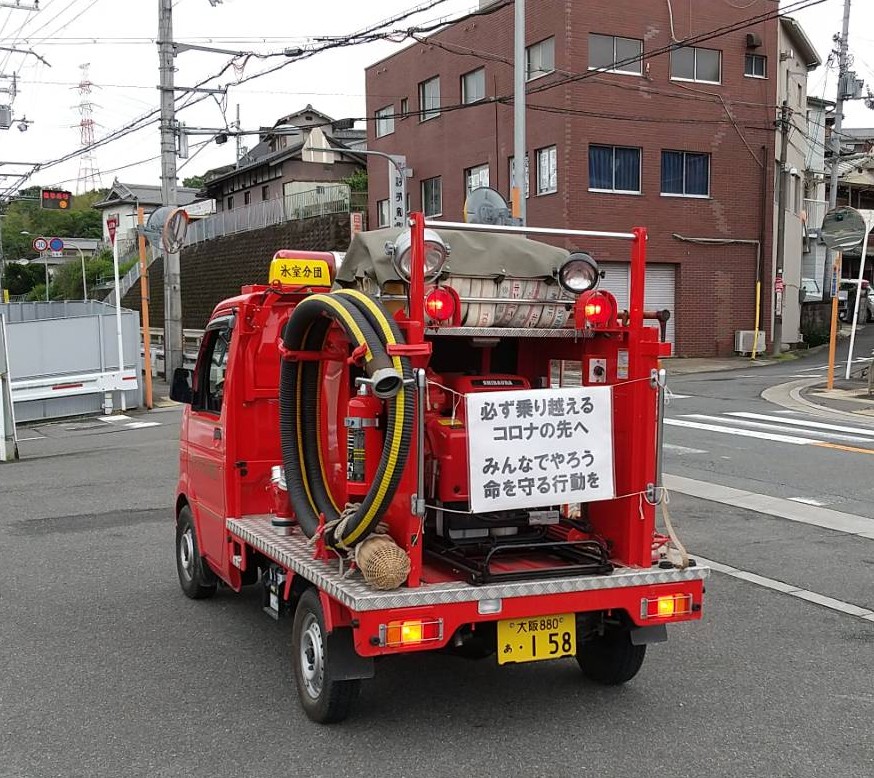 枚方市消防団では、令和3年4月25日から大阪府に新型コロナウイルス感染症拡大に伴う緊急事態宣言が発出された事をうけ、消防車両による車両広報を通じて市民の皆様への啓発を実施し、新型コロナウイルス感染症の拡大防止に努めております。