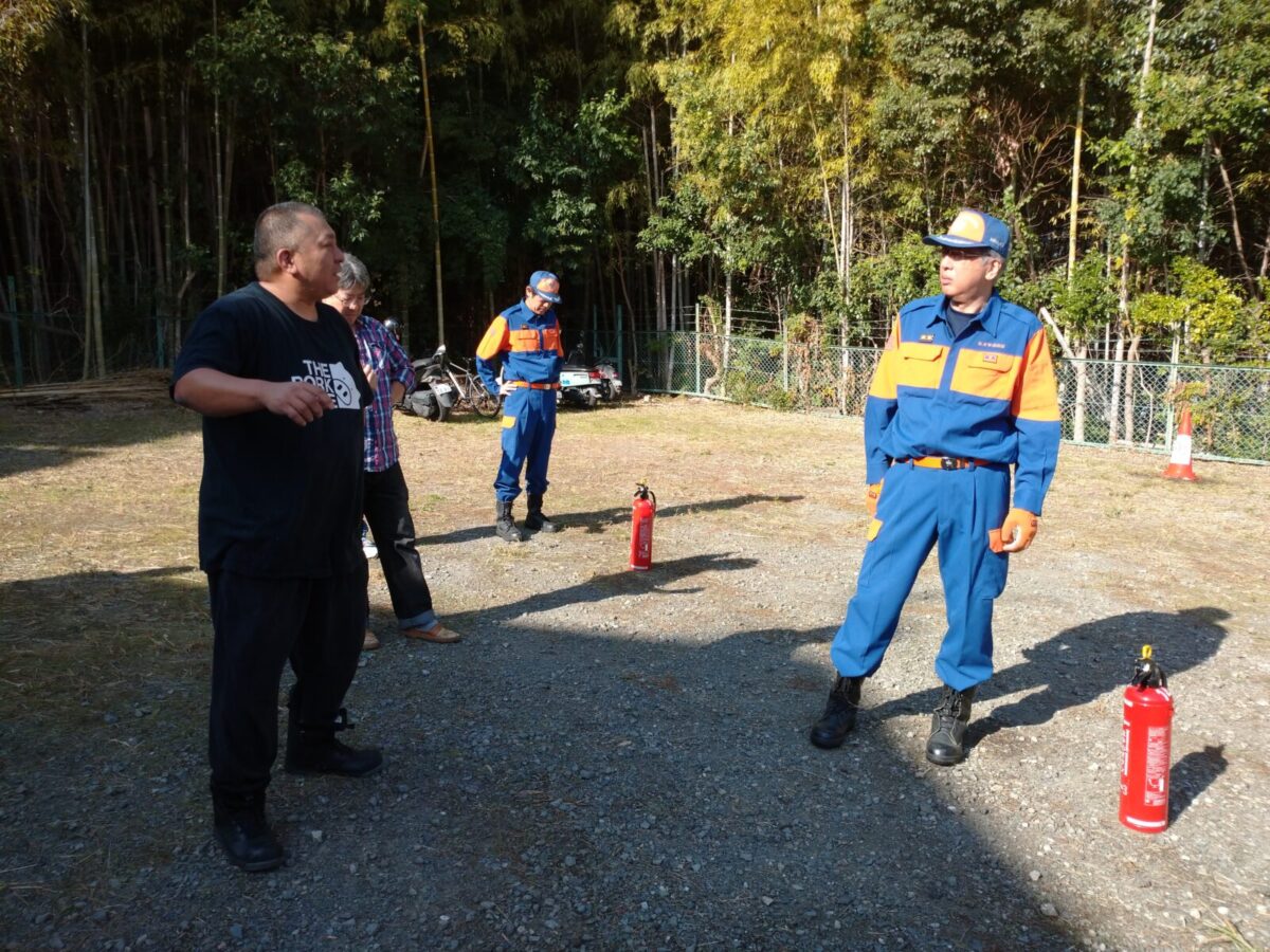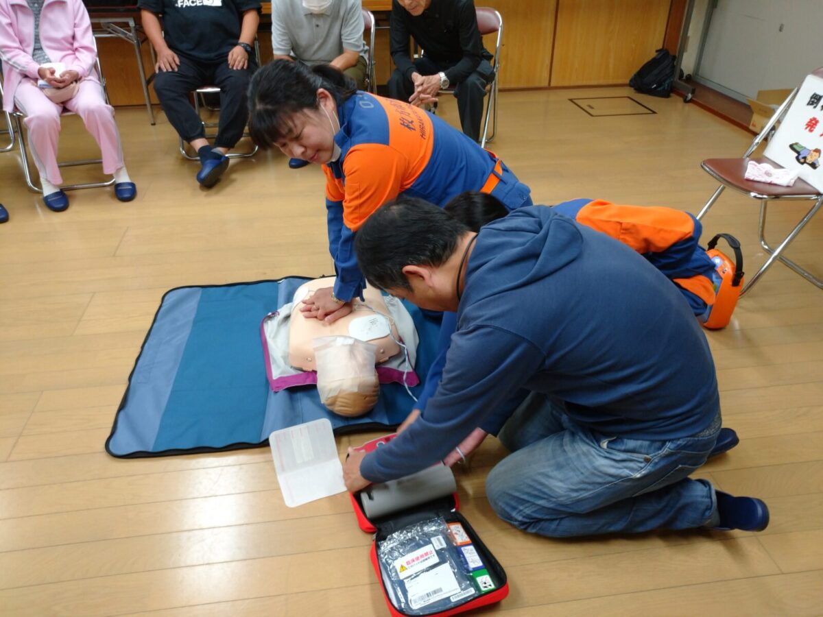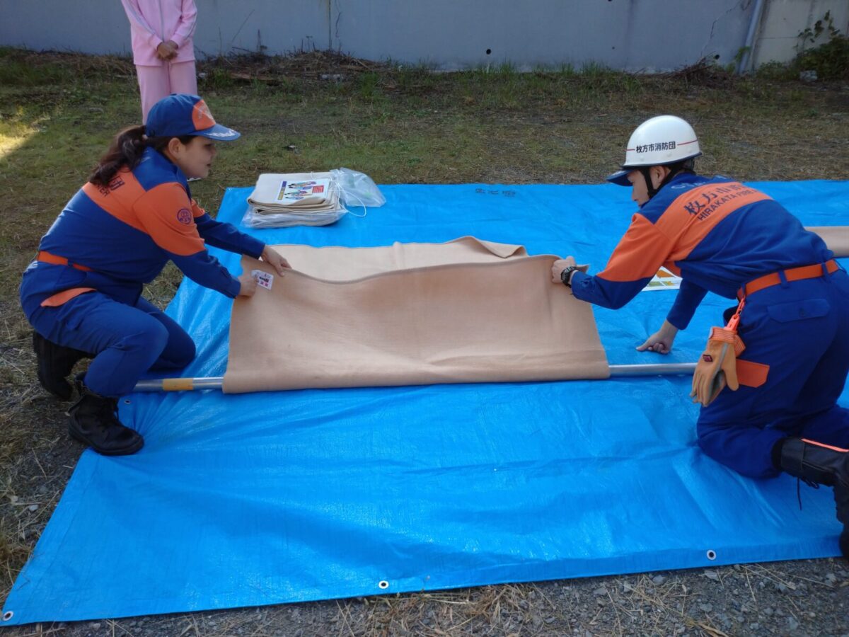 秋晴れの下、招提御殿郷公民館及び公民館下南側空き地に於いて自主防災訓練が開催されました。公民館では女性分団員によるAEDを使用した応急手当の講習会、下の空き地では殿二分団員による消火器の性能や使用法の説明と水消火器を使用しての消火疑似体験訓練及び女性分団員による応急担架の作り方の説明、そして傷病者の抱え方・搬送方法を実践形式で体験しました。