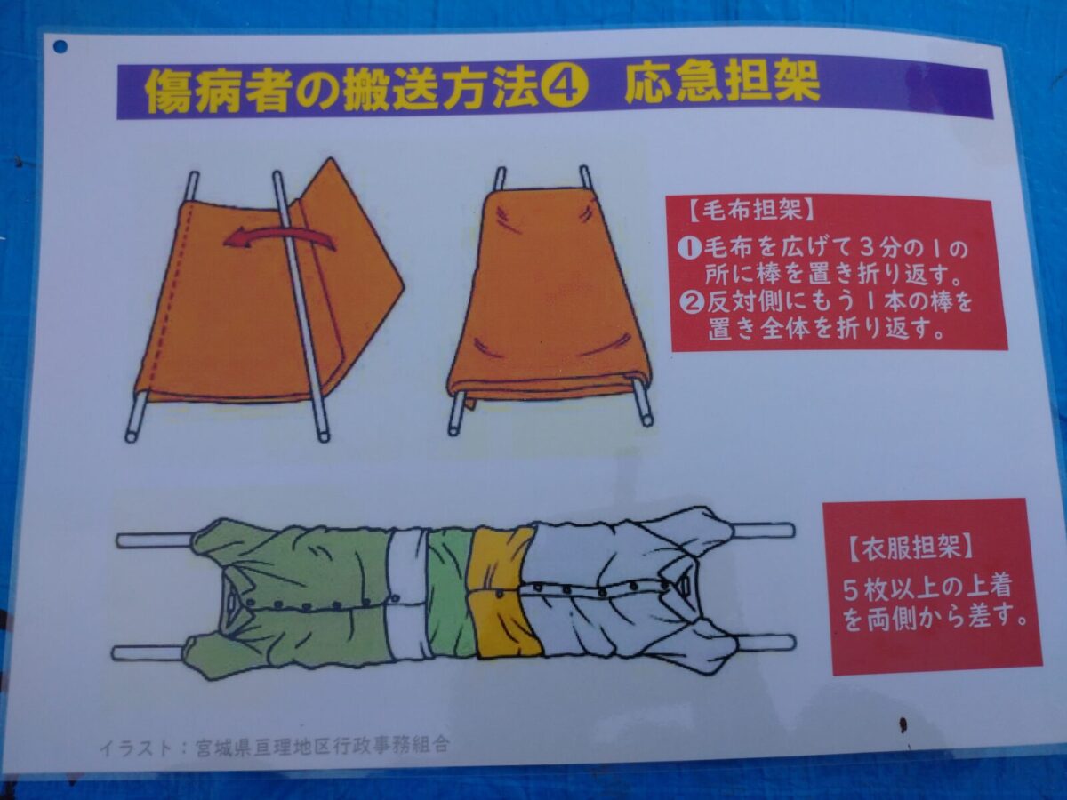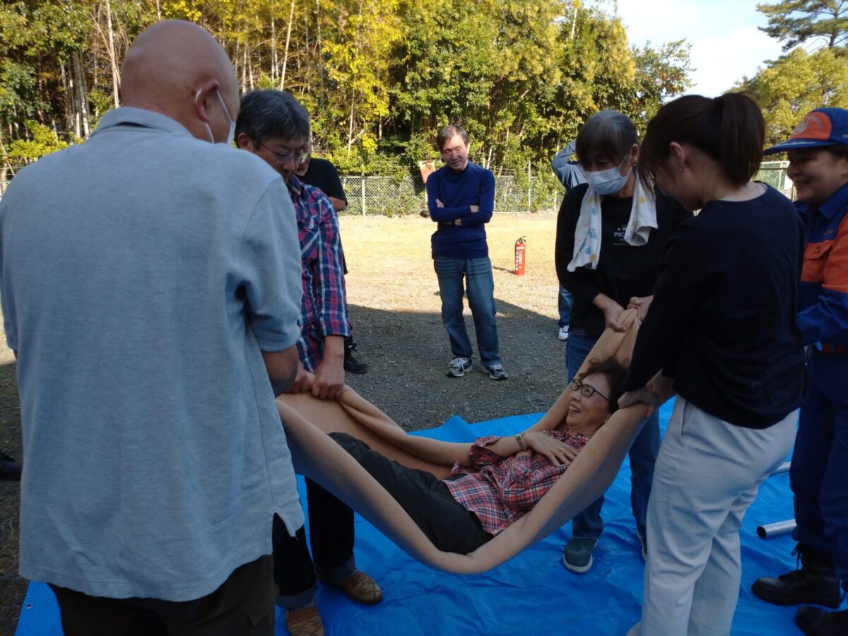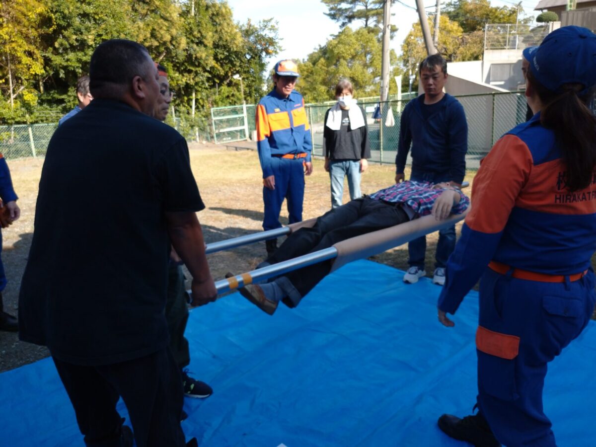秋晴れの下、招提御殿郷公民館及び公民館下南側空き地に於いて自主防災訓練が開催されました。公民館では女性分団員によるAEDを使用した応急手当の講習会、下の空き地では殿二分団員による消火器の性能や使用法の説明と水消火器を使用しての消火疑似体験訓練及び女性分団員による応急担架の作り方の説明、そして傷病者の抱え方・搬送方法を実践形式で体験しました。