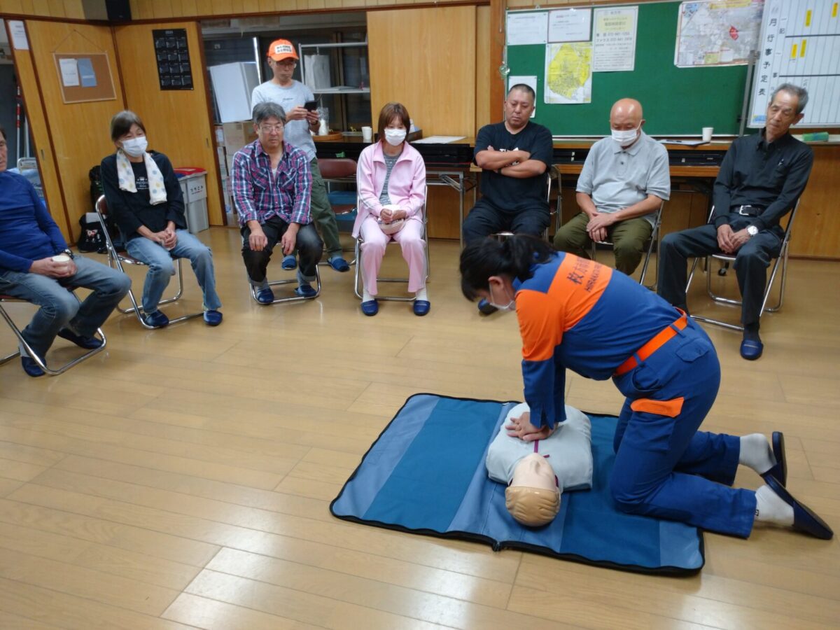 今回の訓練は約2時間に及びましたが、皆さん熱心に各団員の説明に耳を傾けられ、有意義な時間を過ごせたように思います。最後に公民館に集合した際、笹山さんから講評をお願いされた殿二分団の森田部長が「皆さんの身近におられる人たちの生命を守ることができるよう、今回の訓練の経験が皆さんの中に残ると幸いです」とまとめました。