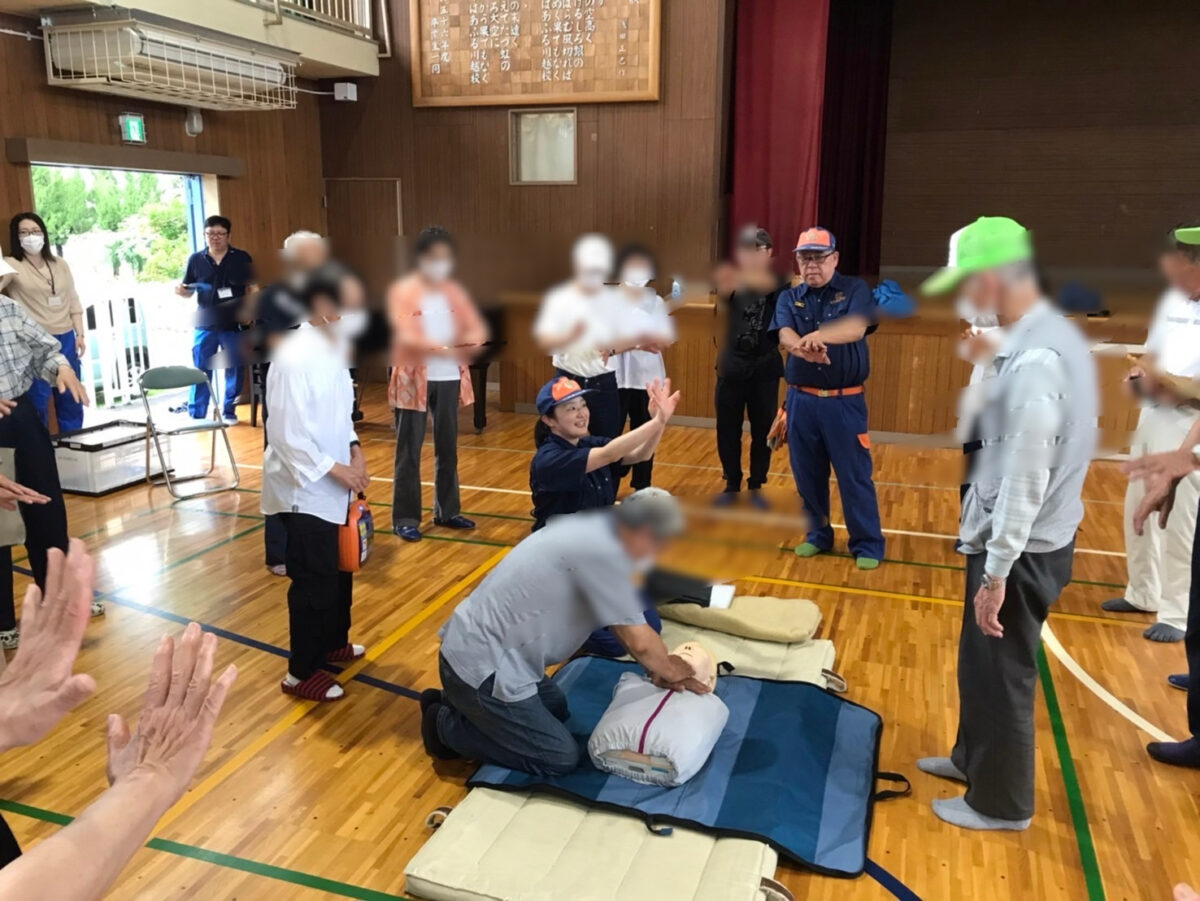 地域ごと4班に分かれ、人形を使って胸骨圧迫・AEDの操作方法、注意点など含め、みなさん協力しながら体験です。