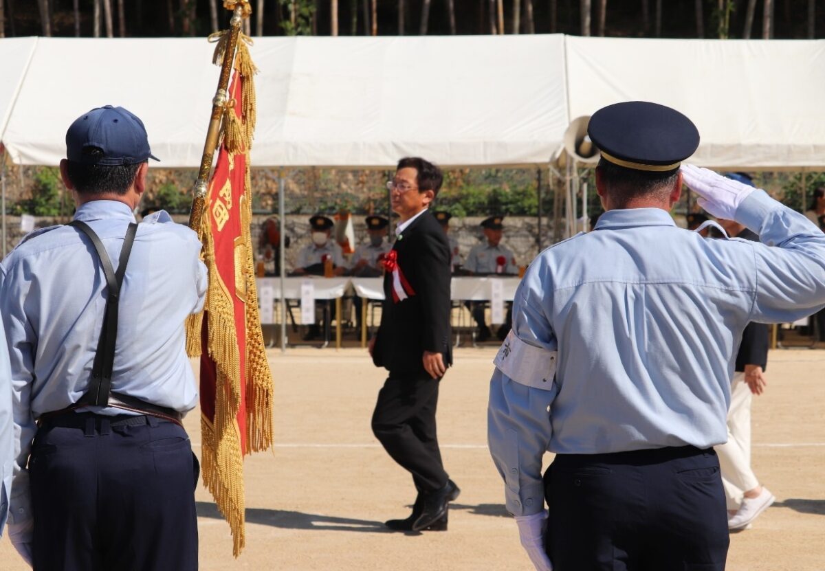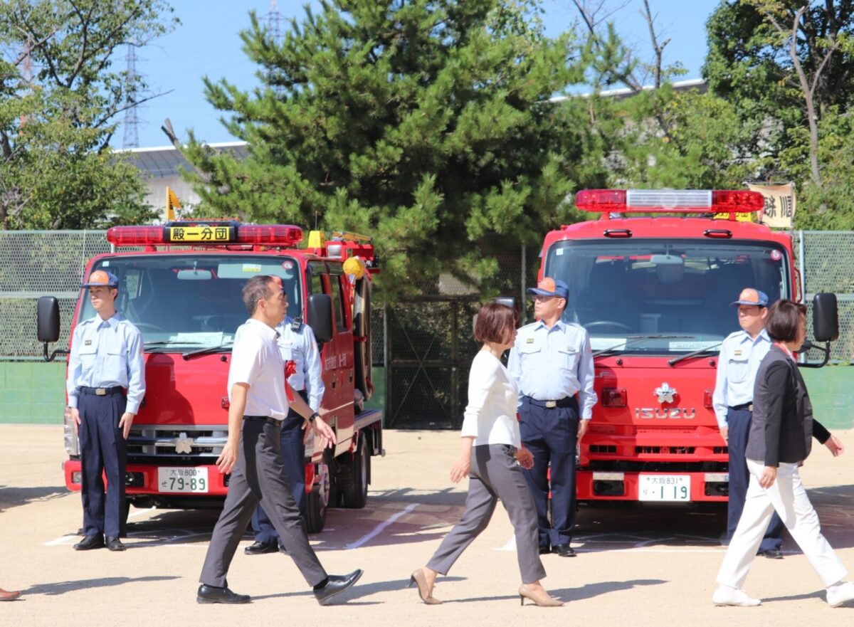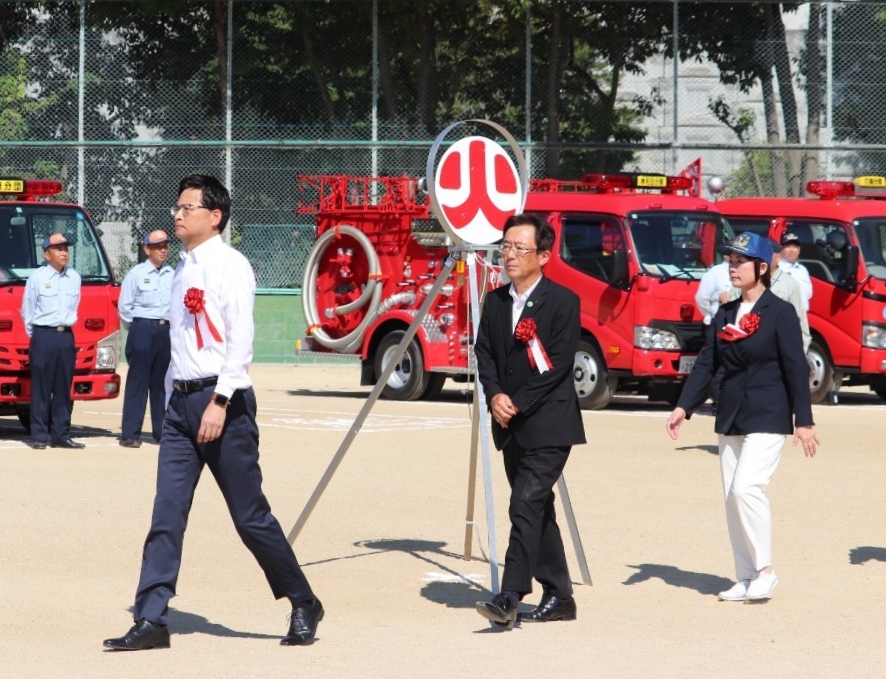 部隊の視閲では、枚方市長代理 小山副市長と枚方市議会 丹生議長が女性消防隊・徒歩部隊・ポンプ操法隊・車両部隊の順に視閲を行いました。