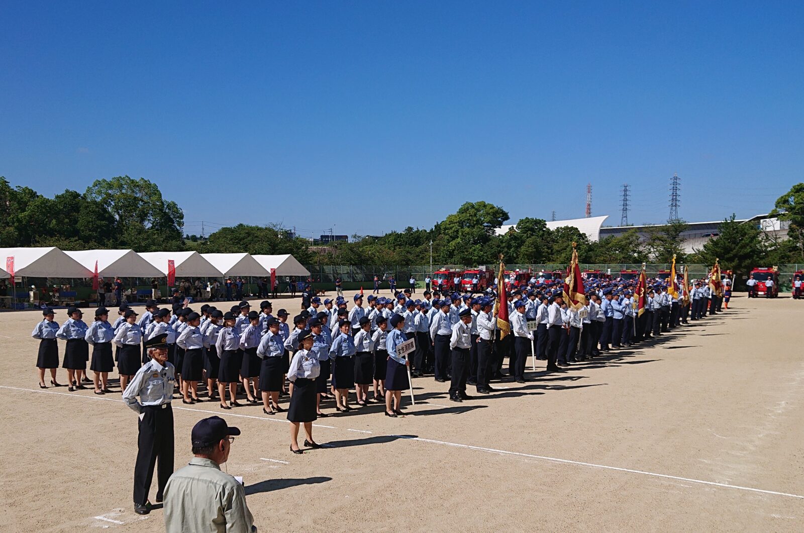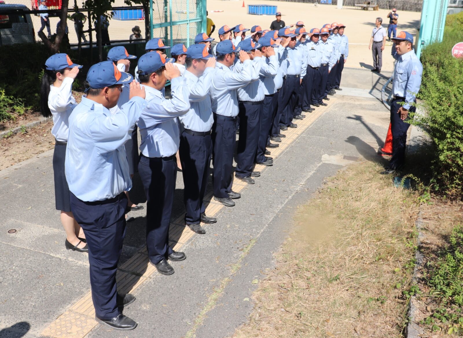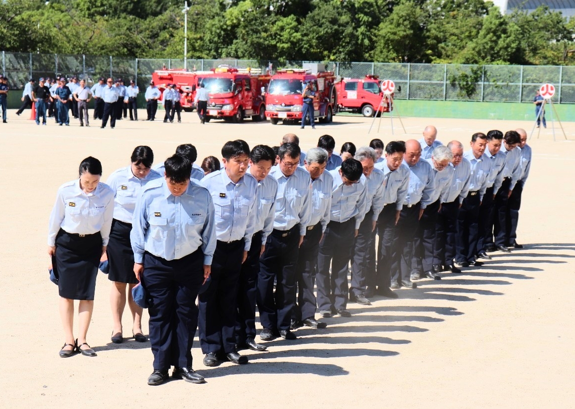 大阪府消防協会北河内地区支部総合訓練大会は午前9時より開始され、部隊の整列後、開会の辞、国旗掲揚後、消防殉職者の御霊に対し黙祷を行いました。