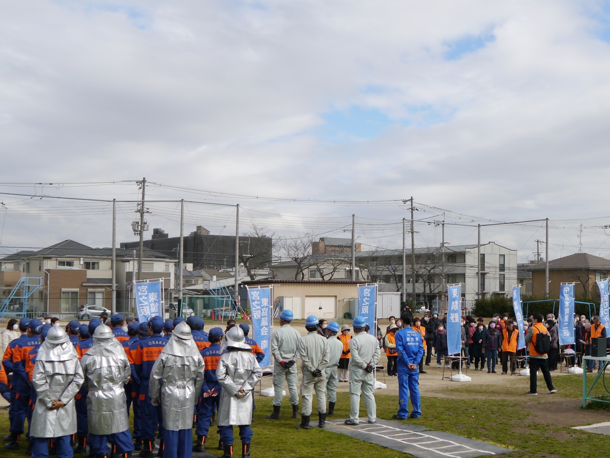 校区を担当する殿一分団(総勢37名)は、一昨年の大阪府消防操法大会に出場した団員が在籍する分団です。大会に出場するにあたり、約3か月間毎晩仕事が終わった後ポンプ操法の訓練を重ね、技術の習得に努めました。
