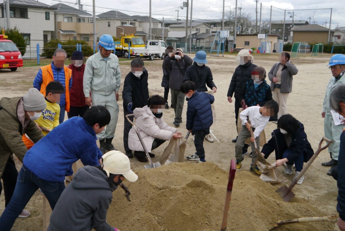 子供たちも率先してスコップを手に取り、土のう作りを体験。