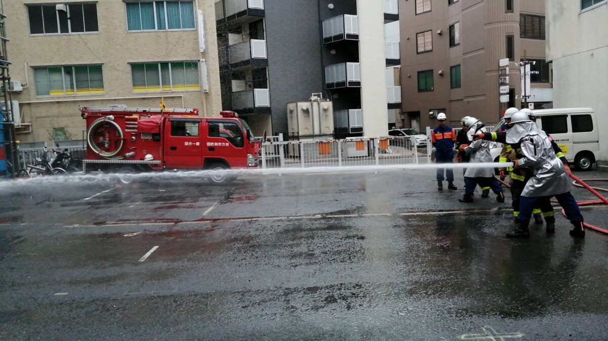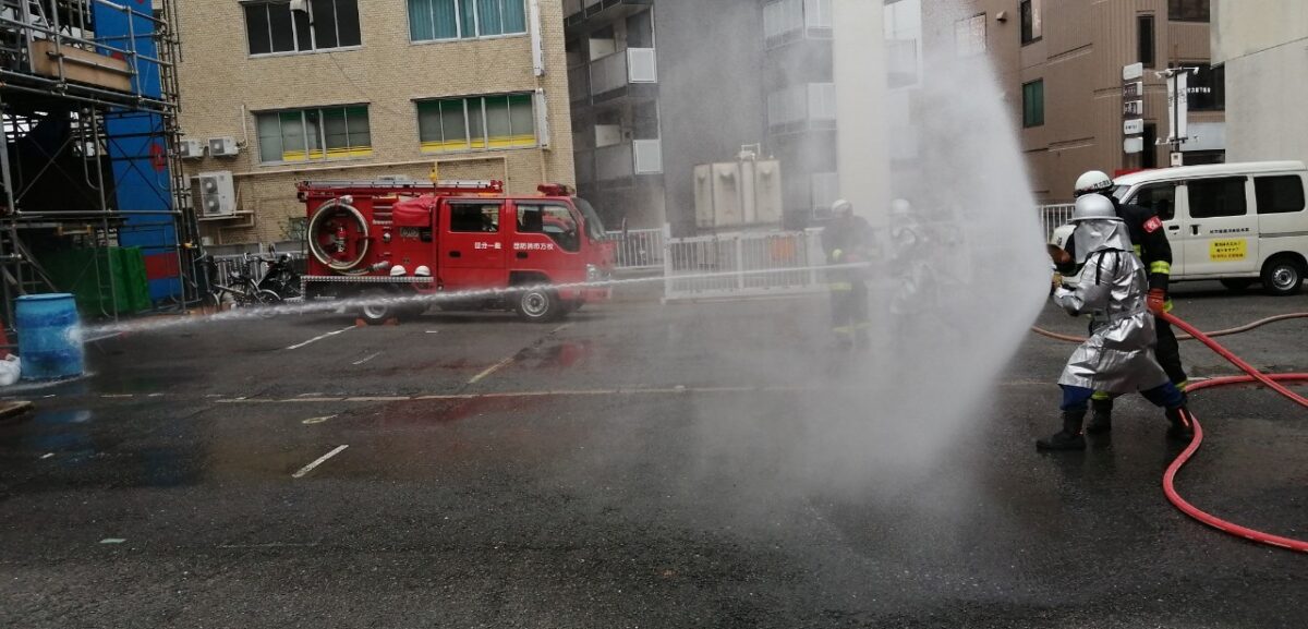 クアドラフォグノズルの特徴と使用方法、取り扱い注意点などを受け放水訓練開始。