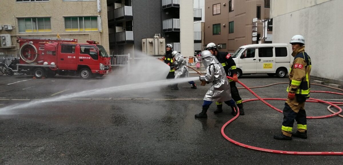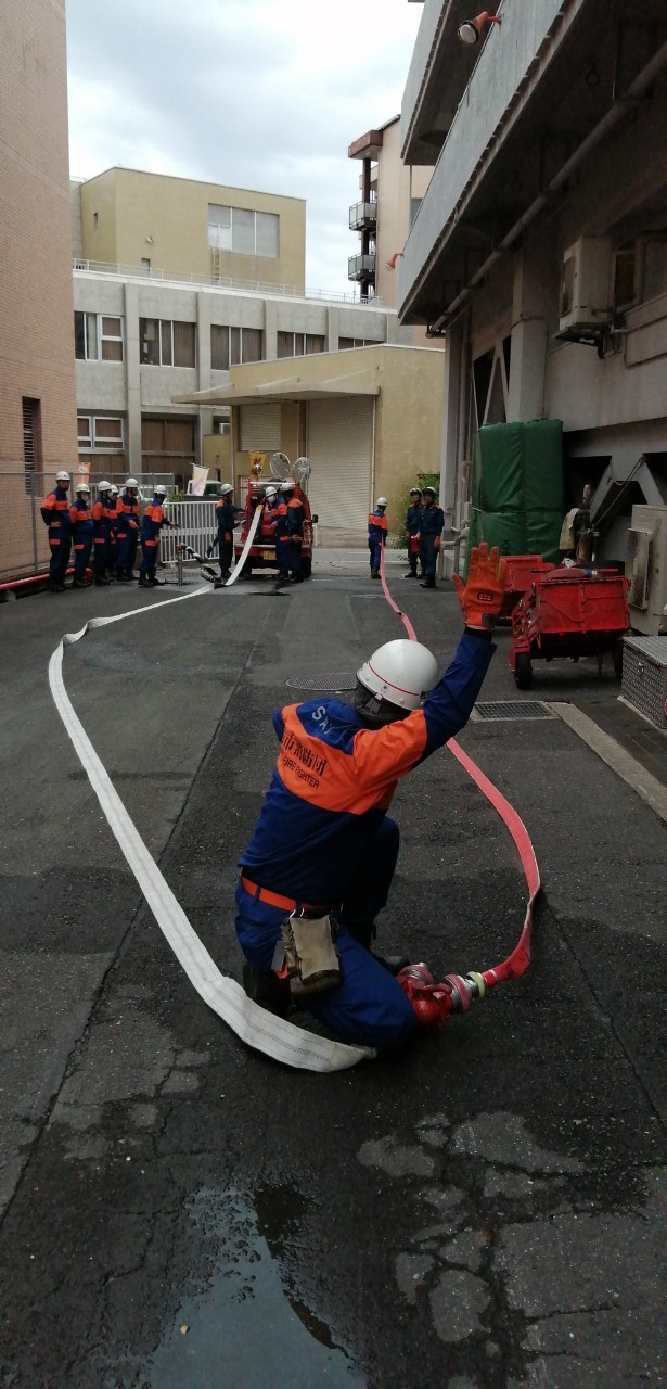 消火栓習熟訓練は、消火栓の開閉から消火栓を利用したホース延長、クワドラフォグノズルで放水するまでの一連の流れを習得する訓練となります。