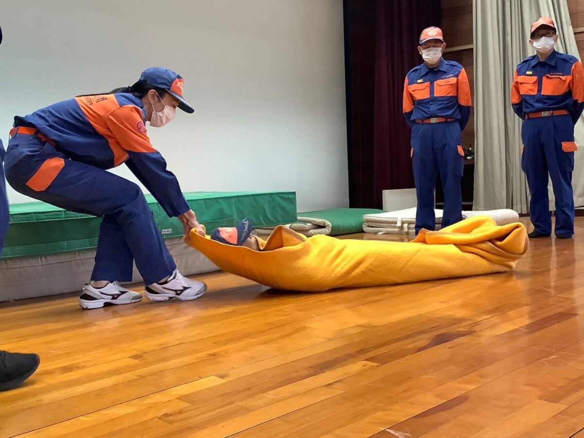 搬送法では、「毛布を利用した応急担架」毛布の両端を丸め持ちやすくして握り、持ち上げる方法や一人で傷病者を移動させる方法。
