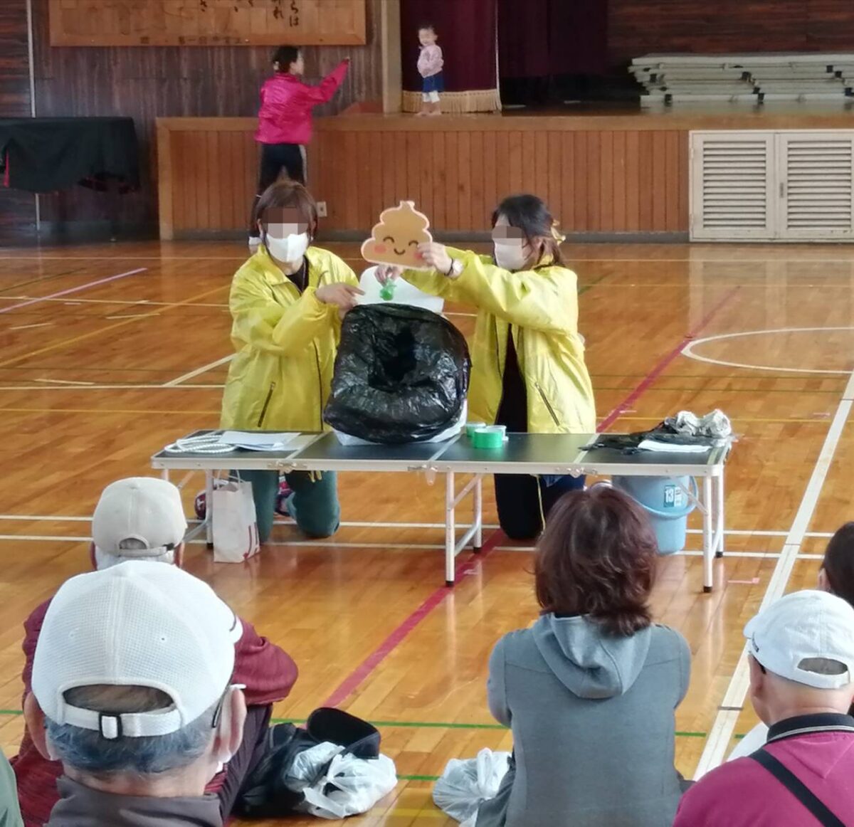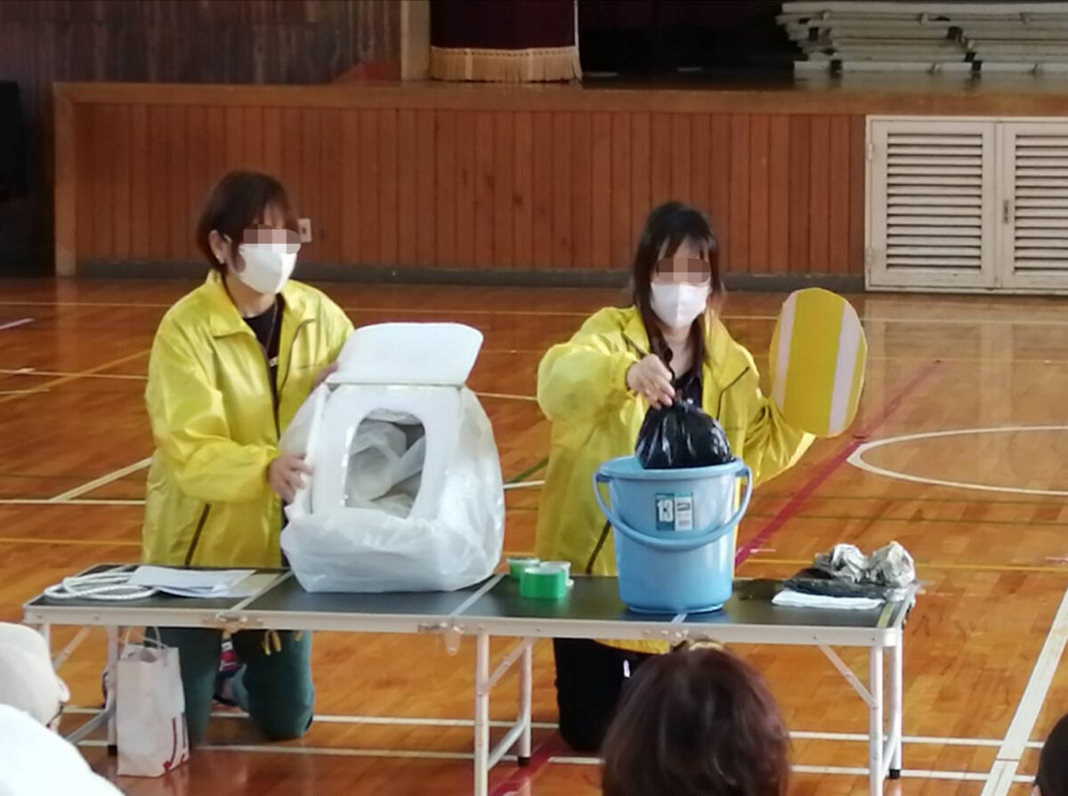 体育館では、地域コミュニティーの方による、簡易トイレの使い方の紹介です。